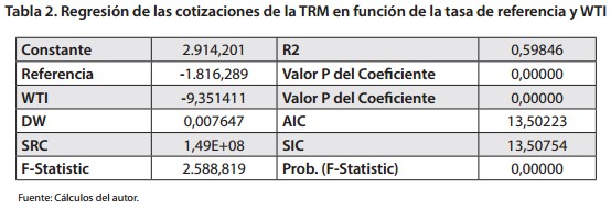 Después de analizar la incidencia de la oferta y demanda de divisas sobre la tasa de cambio nominal, se procedió a establecer la relación estadística existenteentre la tasa de cambio nominal, la tasa de interés de referencia y las cotizaciones del petróleo (WTI) mediante un modelo de Mínimos Cuadros Ordinarios; la tabla 2 presenta los resultados obtenidos en la regresión.