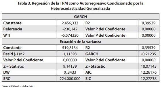 Al correr un modelo GARCH para la tasa de cambio nominal en función de dos variables exógenas (Tasa de referencia y las cotizaciones del WTI) se encontró que ambos elementos explicativos fueron conjuntamente significativos. En efecto, un incremento de un punto porcentual en la tasa de interés de referencia implica una reducción en la tasa de cambio local en 236,14 pesos. Por su parte, al incrementarse en una unidad monetaria el precio del petróleo provoca una reducción de 5,57 pesos en la tasa de cambio local (ver tabla 3).