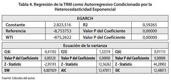 Para presentar un análisis más completo de los datos se corrieron varios modelos y la mejor opción es el EGARCH (1,0,1) de acuerdo con el coeficiente de determinación. La regresión indica que para el periodo analizado el comportamiento de la tasa de cambio nominal local sí estuvo explicado en un 59,26% por las variaciones efectuadas en la tasa de referencia y los precios del petróleo (ver tabla 4).