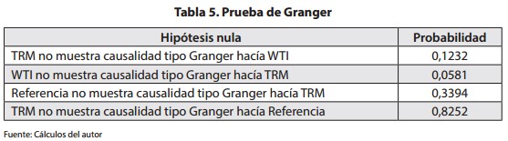 Como punto de partida, se procedió a realizar la prueba de Granger para las variables; los resultados obtenidos se muestran en la tabla 5. Según Granger no hay relación alguna entre TRM y WTI, por ejemplo, hay un 12,32% de probabilidad de aceptar la hipótesis nula que la tasa de cambio nominal no causa tipo Granger a los precios del petróleo y un 5,81% de que WTI no cause tipo Granger a la TRM.