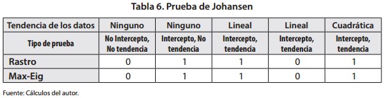 Por el contrario, la prueba de Johansen (ver tabla 6) concluye que si hay vectores de co-integración entre las variables, luego parece que las tres variables han estado relacionadas a lo largo del período de análisis. Por lo tanto, si es posible construirse una regresión con ellas.