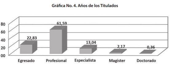 De la población total que participó de la investigación el 77,17% (213 de 276) son titulados, como es lógico en los 15 años en los que se ha entregado profesionales en Administración de Empresas, en los últimos años se ha ido incrementando. En el 2009 los profesionales son el 25,6%, para los demás años.