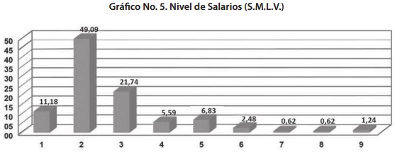 Otra variable que se relaciona en el estudio es el nivel de salarios, los cuales oscilan entre 1 s.m.l.v y 9 s.m.l.v. (entre $600.000 y $5.000.000), el salario promedio es de más de 2 s.m.l.v. ($1.382.656), con una desviación típica de $807.360. Los 2 s.m.l.v, lo devengan el 49,07%.