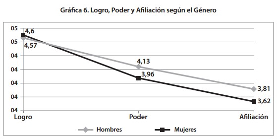 En la jerarquización de las necesidades se encuentra que primero es la necesidad de Logro, luego Poder y finalmente Afiliación para hombres y mujeres. Se encuentra que no hay diferencias significativas en el clúster de Logro para hombres y mujeres, pero si hay diferencias tanto en Poder como Afiliación siendo la calificación superior en los hombres.