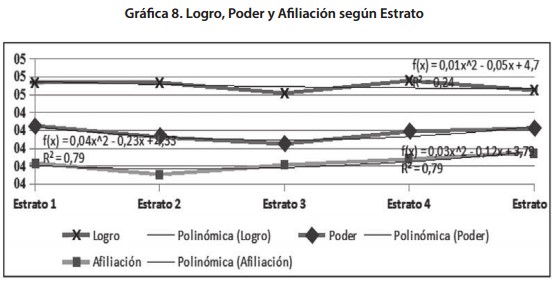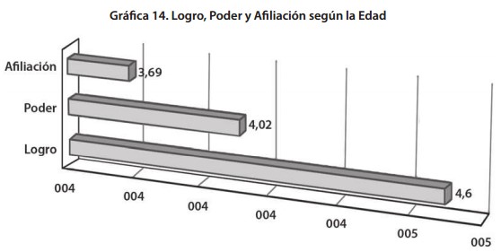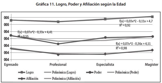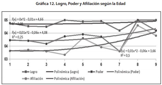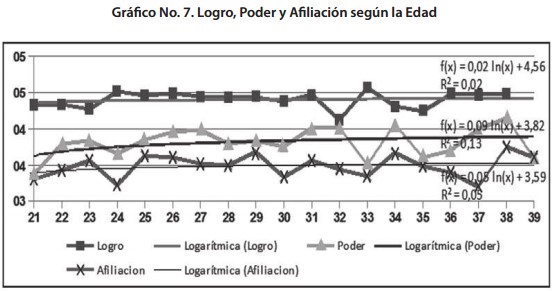 Se descubre que en la medida en que aumenta la edad los tres tipos de necesidades suben lentamente en las necesidades de Logro, Poder y Afiliación. Para predecir el comportamiento de este tipo de necesidades es una tendencia logarítmica.
