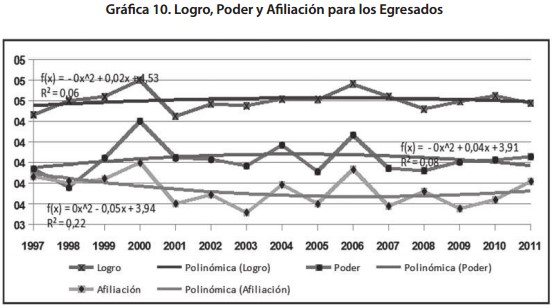 La tendencia de los egresados en cuanto a las tres necesidades se pueden predecir con un polinomio de segundo orden, ver las ecuaciones en la siguiente gráfica.
