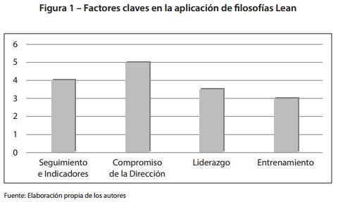 La investigación determinó que hay cuatro factores claves en el éxito de la aplicación de las filosofías Lean, como se aprecia en la Gráfica 1. i) el compromiso de la alta dirección (gerencias, presidencias, vicepresidencias y direcciones de áreas), ii) el seguimiento continuo, con indicadores de gestión apropiados, iii) el liderazgo y iv) el entrenamiento. Estos factores serán discutidos a continuación:
