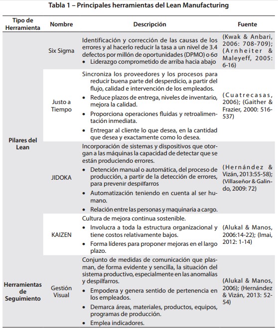 El Sistema Lean se compone de pilares, herramientas y técnicas que se encargan de sustentar los procesos que permiten alcanzar las metas y objetivos de mejora. Un resumen de estas herramientas se encuentra en la Tabla 1.
