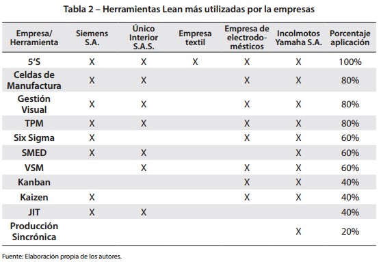 Cada empresa, y de acuerdo con su direccionamiento y necesidades eligió la implementación de ciertas herramientas, algunas con la aplicación general en todos los procesos de la empresa y otras solo en las áreas de producción. La herramienta más generalizada es la de las 5S’s, siendo seguida por Celdas de Manufactura y Gestión Visual como se puede apreciar en la Tabla 2.