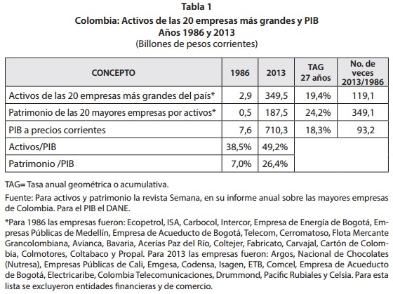 *Para 1986 las empresas fueron: Ecopetrol, ISA, Carbocol, Intercor, Empresa de Energía de Bogotá, Empresas Públicas de Medellín, Empresa de Acueducto de Bogotá, Telecom, Cerromatoso, Flota Mercante Grancolombiana, Avianca, Bavaria, Acerías Paz del Río, Coltejer, Fabricato, Carvajal, Cartón de Colombia, Colmotores, Coltabaco y Propal. Para 2013 las empresas fueron: Argos, Nacional de Chocolates (Nutresa), Empresas Públicas de Cali, Emgesa, Codensa, Isagen, ETB, Comcel, Empresa de Acueducto de Bogotá, Electricaribe, Colombia Telecomunicaciones, Drummond, Paci'c Rubiales y Celsia. Para esta lista se excluyeron entidades 'nancieras y de comercio.