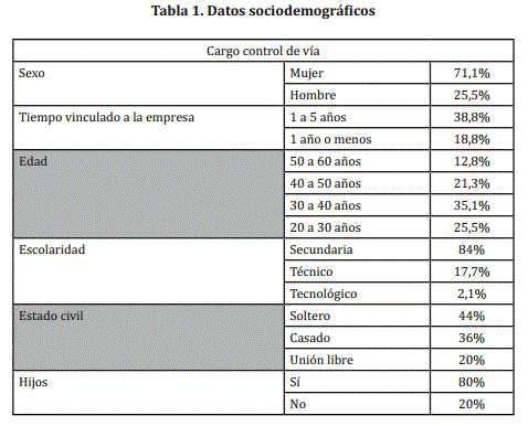 Los resultados obtenidos contienen información referente a datos sociodemográficos y morbilidad sentida la cual está compuesta por una ficha de antecedentes médicos y manifestaciones actuales, así como un apartado que hace referencia a las actitudes de los colaboradores que desempeñan el cargo control de vía hacia las categorías de salud laboral, bienestar laboral y percepción del trabajo.