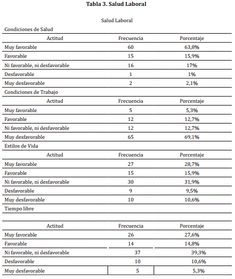 A continuación se presenta la información encontrada en la categoría de salud laboral (Ver tabla 3), que se compone de las subcategorías de condiciones de salud, condiciones de trabajo, estilos de vida y tiempo libre.