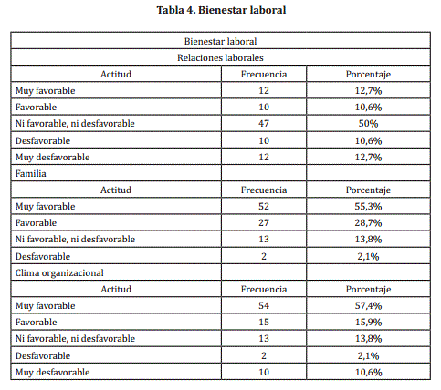 A continuación se presenta la consolidación de la información respecto a la categoría de bienestar laboral (Ver tabla 4) que se compone de las subcategorías de relaciones laborales, familia y clima organizacional.