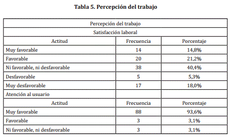A continuación se presentan los resultados de la categoría percepción del trabajo (Ver tabla 5), que se compone de las subcategorías de satisfacción laboral y de atención al usuario.