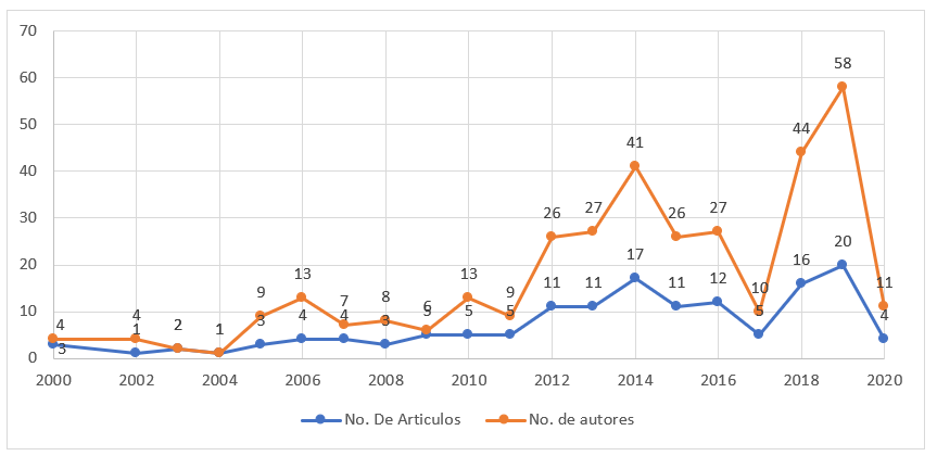 Figura 3. No. de Artículos y Autores 2000 – 2020.