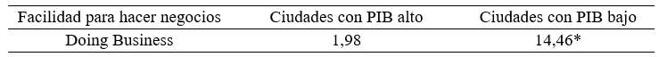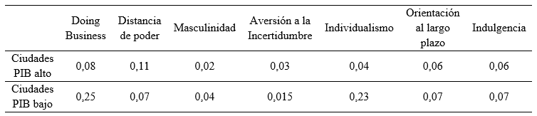 En arreglo con el contraste de hipótesis, para el grupo de ciudades con PIB bajo, la IE depende estadísticamente de la facilidad para hacer negocios; en referencia con lo anterior, la matriz de correlación define la variable Doing Business (facilidad para hacer negocios) como elemento de mayor peso en la IE en este grupo de ciudades en comparación con las dimensiones de Hofstede; por su parte, en las ciudades de PIB alto dicha variable no explica la IE.
