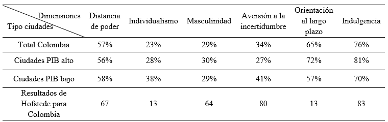En particular, los resultados estimados en este trabajo para cada grupo de ciudades no muestran uniformidad respecto a los hallazgos de Hofstede (2001) para Colombia; a saber, las dimensiones Distancia de poder, Individualismo e Indulgencia, indican estadísticos en la misma escala de los de dicho autor; no obstante, las estimaciones para las variables Masculinidad, Aversión a la incertidumbre y Orientación al largo plazo, presentan disimilitudes frente al mencionado autor.