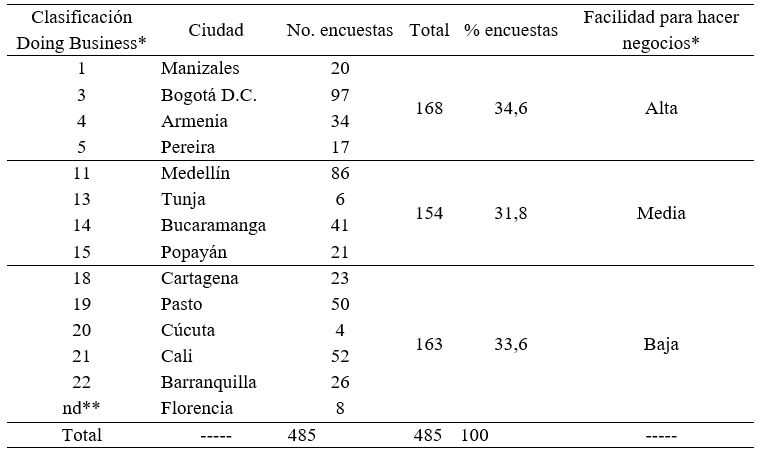Por otra parte, la variable relacionada con la facilidad para hacer negocios se obtuvo a partir del ordenamiento que hace el estudio Doing Business en Colombia (2013); las 23 ciudades en las que se realiza la mencionada investigación se dividieron en tres grupos (facilidad alta, facilidad media y facilidad baja) (Tabla 2).