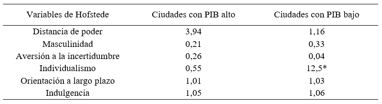 En cualquier caso, empleando la escala de Hofstede para la medición del criterio de los estudiantes, no se evidencian disparidades considerables entre cada grupo de ciudades; desde luego, el análisis descriptivo a partir de frecuencias absolutas refleja que el colectivismo tiene mayor peso en las ciudades de PIB alto a diferencia del resultado del estudio de Hofstede (2001) y una frecuencia más alta a la prevista en las ciudades de PIB bajo. Este hallazgo complementa los resultados del trabajo de Tarapuez (2016), quien destaca la existencia de diversas subculturas dentro de un mismo país y cuyas características propias pueden influir en la IE a nivel regional. En un estudio intercultural, Shneor et al. (2013) encontraron que si bien algunas variables como el género pueden influir en la IE de las personas, dicha intención depende del contexto cultural de su país de procedencia.