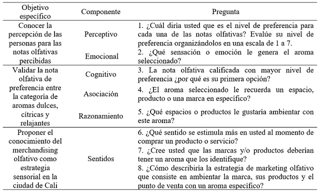 Para ello, se propusieron tres objetivos fundamentales. El primero es conocer la percepción de los consumidores sobre las notas olfativas; el segundo es validar la nota olfativa de preferencia entre las familias odoríficas: dulces, cítricas y relajantes; y el tercero es proponer el conocimiento del merchandising olfativo como estrategia sensorial para las empresas ubicadas en la ciudad de Cali.