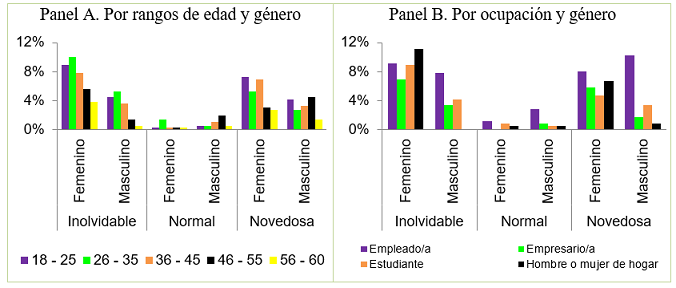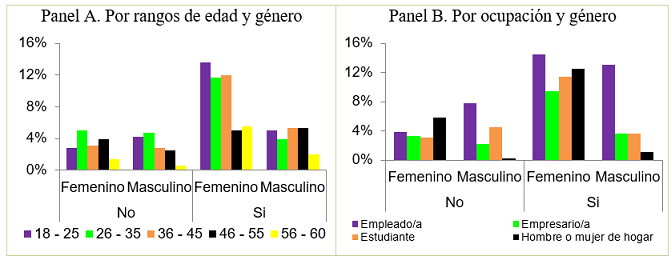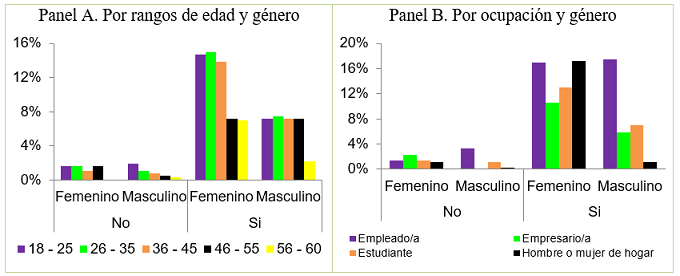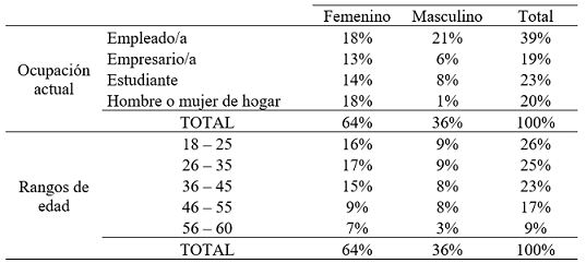 Es así como en la Tabla 2 se logra observar que el 64% de los encuestados fueron mujeres y el 36% fueron hombres. Así mismo, el 58% de las personas fueron empleados o empresarios. Relacionado con la variable de edad, la proporción de encuestados más alta estuvo en el rango de 18 a 25 años, seguido por el rango de 26 a 35 años y así sucesivamente fue cayendo la proporción por rangos hasta llegar a los 60 años de edad.