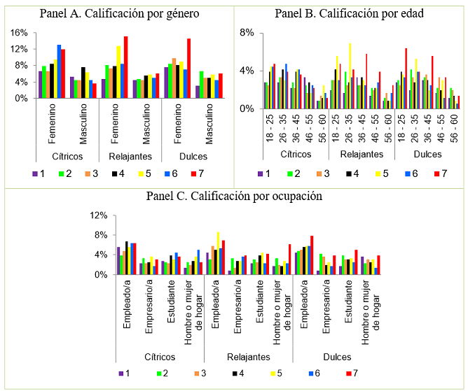Teniendo en cuenta la ocupación, se puede analizar en el Panel C, que las mayores preferencias (calificaciones de 5 a 7) hacia los aromas relajantes son por parte de los empleados y empresarios, los aromas cítricos y relajantes para las amas de casa y hombres que permanecen en el hogar, mientras que para los estudiantes no hay preferencia significativa en alguna de las tres notas olfativas.