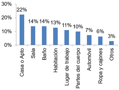 De otro lado, se puede deducir información sobre los espacios o productos que al consumidor le gustaría ambientar con el aroma seleccionado. Así, el 22% de los encuestados respondieron que el lugar donde viven como casa o apartamento (Apto) es el de mayor preferencia por ambientar, sin discriminar el espacio dentro de dicho lugar, mientras que el 47% fueron específicos con el espacio por ambientar dentro del lugar donde viven, discriminados con el 14% en la sala, el 14% en los baños, el 13% en la habitación y el 6% cajones y ropa.