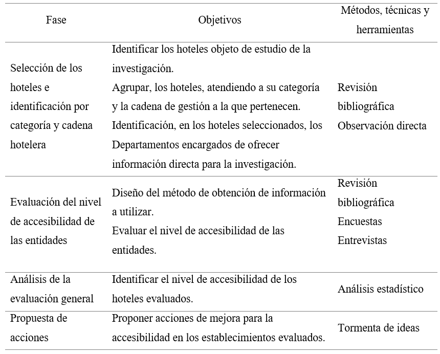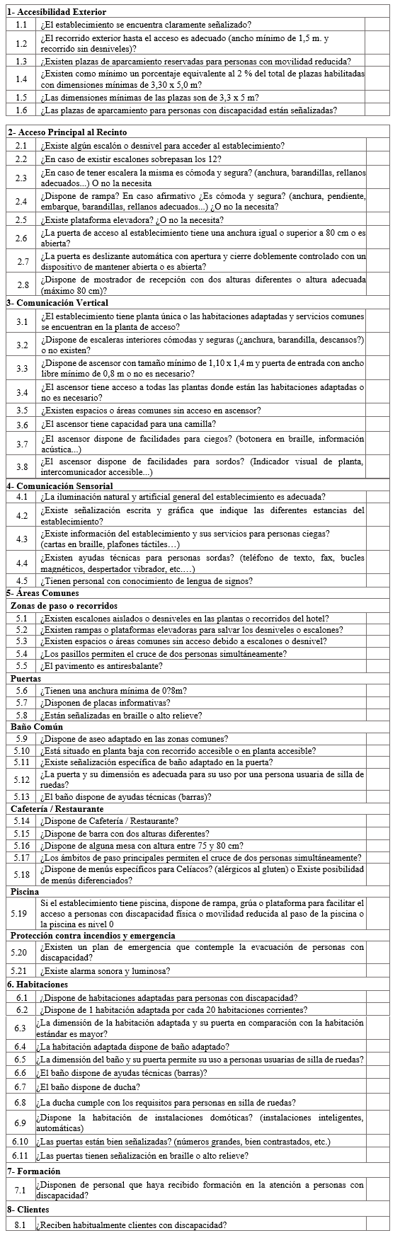 Para el desarrollo de la misma, fue necesario la evaluación del nivel de accesibilidad de los hoteles objeto de estudio. Para definir los elementos evaluados por los expertos se tuvo en cuenta los estudios realizados por Fernández (2007), Martos (2012), Suriá y Escalona (2014), Rodríguez (2017) y Guamán et al. (2019). Luego de establecer una comparación entre estas metodologías se tomó como referencia la que incluye un número mayor de ítems a evaluar, Rodríguez (2017). Posteriormente, mediante trabajo de conjunto entre los autores, se elaboró un modelo o instrumento de evaluación adaptado al contexto de la investigación. En este modelo se reagruparon los emplazamientos valorados en dicha investigación y se tuvo en cuenta, además, la existencia de personal en el hotel con formación en la atención de personas con alguna discapacidad y la recepción habitual de clientes con discapacidades.