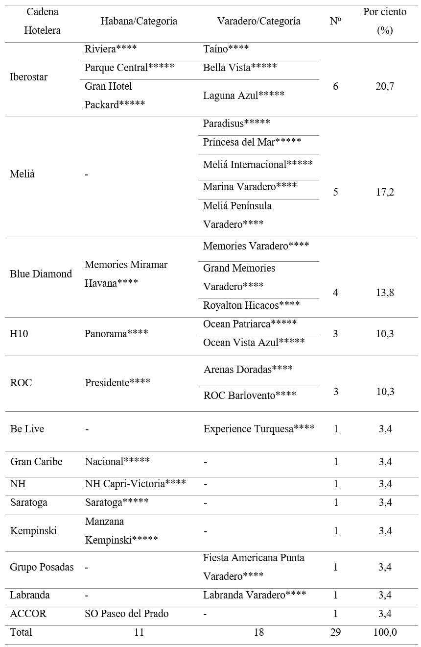 Los datos muestran que el 20,7% de los 29 establecimientos (Tabla 2), que formaron parte del estudio, pertenecen a la Cadena hotelera Iberostar con seis hoteles, tres de ellos ubicados en La Habana y tres en Varadero, cuatro de ellos tienen la máxima categoría. Le siguió la cadena Meliá, la cual estuvo representada por cinco hoteles (17,2%), todos localizados en Varadero y tres de ellos ostentan la categoría cinco estrellas. Del total de instalaciones objeto de estudio, 17 ostentan la categoría cuatro estrellas.