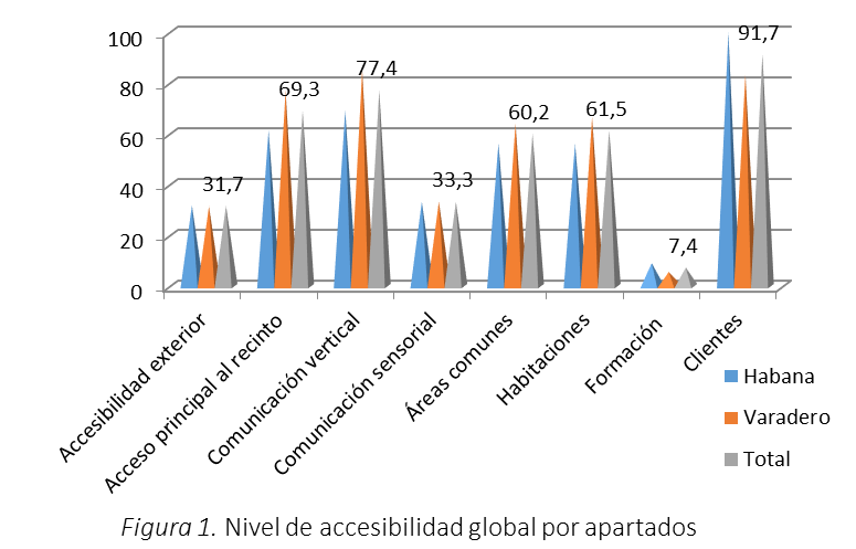 Al evaluar los niveles de accesibilidad en los hoteles objeto de estudio, se determinaron varias insuficiencias que evidencian la necesidad de continuar en la mejora de las infraestructuras que permitan elevar la calidad de los servicios. La investigación permitió determinar que la formación del personal posee un nivel de desarrollo muy bajo, mientras que la comunicación sensorial y la accesibilidad exterior obtuvieron un nivel bajo, influyendo negativamente la falta de ayudas técnicas y de carácter humano para personas con discapacidad, así como plazas reservadas para personas con discapacidad en los aparcamientos.