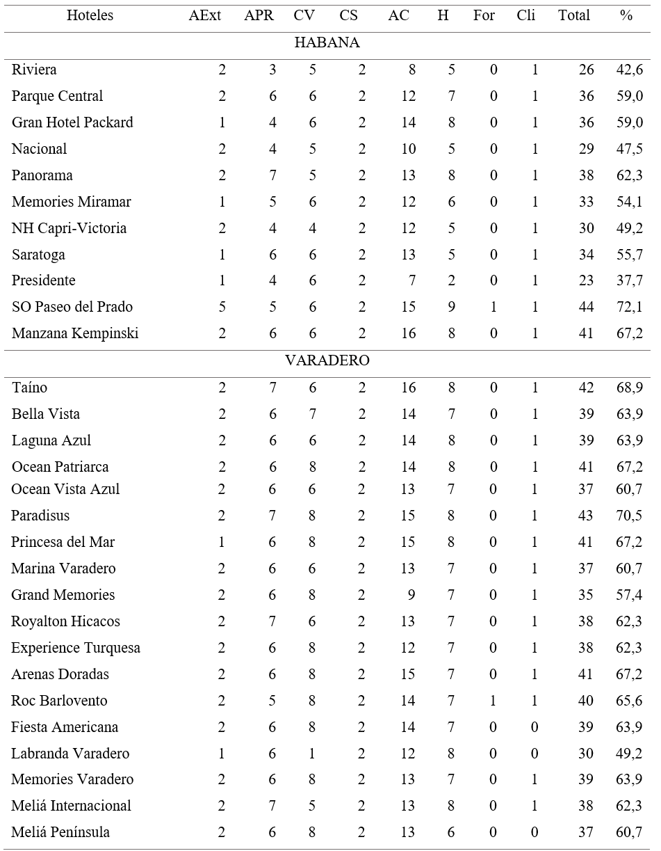 En la Tabla 3 se muestran los resultados obtenidos por cada hotel según apartados analizados. Este análisis permitió identificar que en la formación del personal fue donde mayores deficiencias se detectaron, seguidas de la accesibilidad exterior y la comunicación sensorial. El hotel que posee mayor grado de accesibilidad es el SO Paseo del Prado de la capital (72,1%), de la cadena ACCOR, con un nivel alto, el cual ostenta categoría 5 estrellas, mientras que el de menor nivel es el hotel ROC Presidente de La Habana (37,7%), único hotel que obtuvo un nivel bajo de accesibilidad.