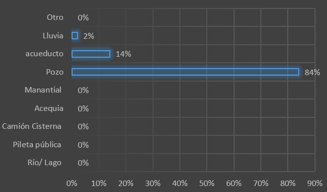 Como se expresa en la Figura 5, el 84% de las viviendas consultadas tienen como fuente principal de agua el pozo, lo cual indica que no tienen acceso al acueducto y por ende a alcantarillado y mucho menos al agua con calidad de potable para el consumo humano. Lo anterior da muestra de una de las carencias más sentidas de las comunidades nativas dedicadas a ejercer actividades de servicio turístico de sol y playa en los Municipios del Golfo de Morrosquillo.