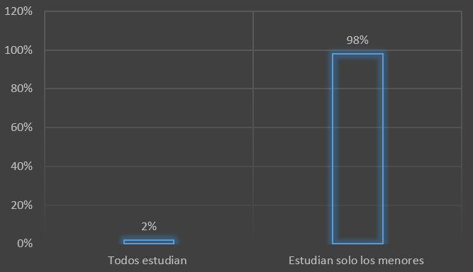 Como se expresa en la Figura 6, el 98% de los miembros de la familia no estudia en la actualidad, considera que es tarea de los menores, niños básicamente, los cuales asisten a las instituciones públicas de los Municipios, de lo cual se infiere que el nivel de escolaridad de los adultos no alcanza la media y en algunos casos existe analfabetismo entre los mayores.
