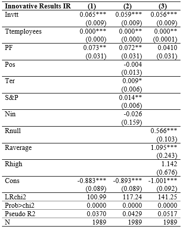 To contrast the hypotheses, the software STATA was used. Since this research's purpose relies on the probability of obtaining innovative results, a regression model of qualitative response, "logit," was tested, considering it allows to determine the probability of occurrence of an event with two possible outcomes (Gujarati, 2011). The results of this model are presented in Table 1. Column 1 presents the results obtained from the direct relationship between public funding investment and the innovative results obtained by firms. Column 2 shows the moderating effect of human capital qualification on the relationship between public funding and companies' acquirement of innovative results. Column 3 shows the moderating effect of the ability of companies to relate to stakeholders of their environment.