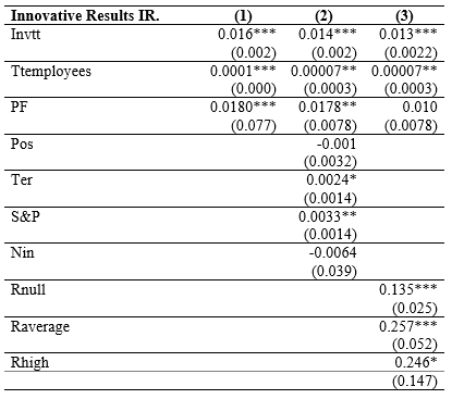 The analysis results show that public funding affects, although low, statistically significant on companies' innovative results. Therefore, it can be affirmed that the greater the public resources allocated to companies to invest in technology, science, and innovation, the greater are the probability that they will achieve innovative results; this aspect has also been verified by the researches of Wong & He (2001), Zhang & Liu (2010), Hanel (2003), Albors-Garrigos & Rodríguez (2011), although they are carried out in other countries, they indicate the influence of public resources in R&D on innovative results.