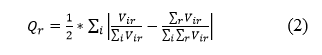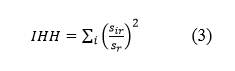 Donde Qr es el coeficiente de especialización (CE) regional, el cual refleja las características de la estructura económica de la región r, si presenta especialización relativa cuando el indicador se aproxima a uno (1) o diversidad relativa si más bien se aproxima a cero (0). En la ecuación (2), V es una variable econó mica de interés, por ejemplo, el VAB, con lo cual puede conocerse la distribución o estructura económica de la región. De ese modo, Vir representa el VAB del sector i en la región r de un período, mientras que el denominador que lo acompaña recoge el VAB total de la región, la suma de los valores agregados de cada actividad dentro de la región r. Otra medida de diversidad es provista por lo que la literatura conoce como mediciones equiproporcionales o de entropía (Pede, 2013; Wagner, 2000), como el Índice Hirschman Herfindhal (IHH), para conocer qué tanta concentración por sectores presenta la producción de una región, a través del VAB de sus actividades o sectores, mismo que se muestra en la ecuación (3):