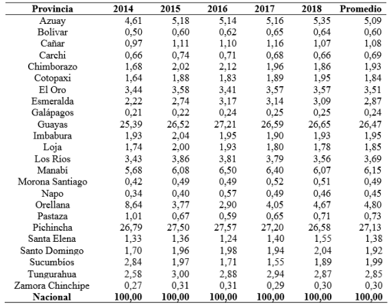 La figura 1 muestra el porcentaje del Valor Agregado Bruto (VAB) de las provincias respecto al VAB nacional en cada uno de los años. La ponderación refleja la estructura productiva por regiones del Ecuador, en términos relativos, mostrando lo aportado por cada provincia al producto nacional. La última columna de la tabla muestra la participación media de 2014-2018 para cada provincia.