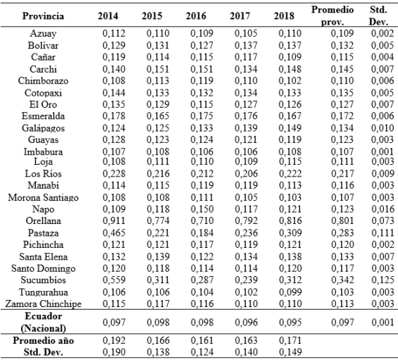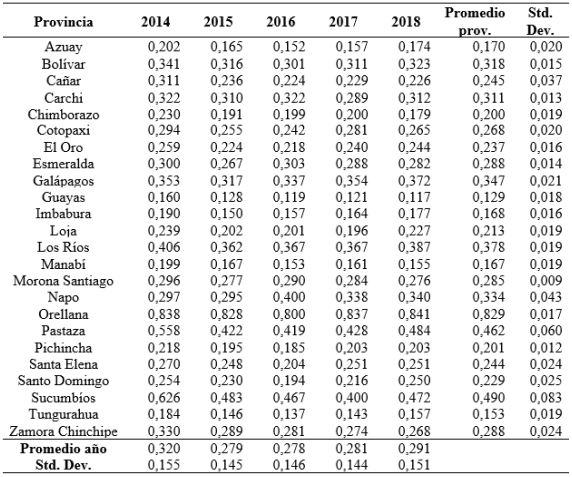 son presentadas como un promedio del período T (2014-2018). La recopilación de estadísticas se realiza desde fuentes secundarias, como lo son bases de datos del Banco Central del Ecuador [BCE] y del Instituto Nacional de Estadísticas y Censos [INEC], complementada con cálculos propios. La población está conformada por las 24 provincias ecuatorianas y la delimitación temporal cubre el lapso 2014-2018.