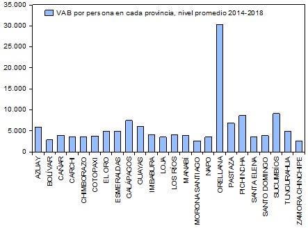 En los cinco años, el VAB de las provincias de Guayas y Pichincha significaron en promedio 26,47% y 27,12%, respectivamente del VAB ecuatoriano. Otras provincias como Manabí (6,41%), Azuay (5,09%) y Orellana (4,83%) tuvieron una participación destacable en el contexto de la estructura nacional, aunque en el caso de Orellana pudo estar determinada por el desempeño del sector petrolero más que por un cambio estructural en su economía, en cuyo caso otras actividades habrían ganado peso, contribuyendo al crecimiento sostenido de esta región.