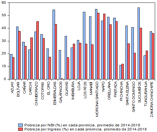 En relación a la pobreza como reflejo de las condiciones socioeconómicas, los indicadores en la figura reflejan que, generalmente, la pobreza está presente en Ecuador en diferentes grados a lo largo de todas las provincias. En cuanto a la pobreza por Necesidades Básicas Insatisfechas (NBI), el promedio entre las 24 provincias alcanzó 36,7%, abarcando un rango que va desde un mínimo de 10,9% en Pichincha, hasta una tasa máxima de 56,3% en Sucumbíos. Incluso, esta última provincia llegó a presentar una tasa de pobreza por NBI de 62,8% en el año 2016. Por su parte, apenas 3 provincias dispusieron de una tasa de pobreza por NBI en el rango 10-20%. El resto, presentan valores por encima del 20%, incluso cuatro regiones con tasas superiores a 50%.