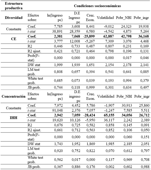 Los efectos que tiene la diversidad económica sobre las condiciones socioeconómicas observadas en las provincias del Ecuador se miden mediante un conjunto de regresiones. Se llevaron a cabo diferentes ejercicios econométricos donde la variable dependiente es algún indicador de las condiciones socioeconómicas, entre ellos, el nivel de ingreso per cápita (en logaritmo), la tasa de variación del ingreso per cápita, como medida del crecimiento, la desviación estándar de la serie tasa de variación del ingreso per cápita, como indicador de la volatilidad de las economías regionales en el período, la tasa de pobreza por NBI y la tasa de pobreza por ingreso como medidas de la pobreza, siendo estas dos últimas la que reflejan las condiciones sociales.