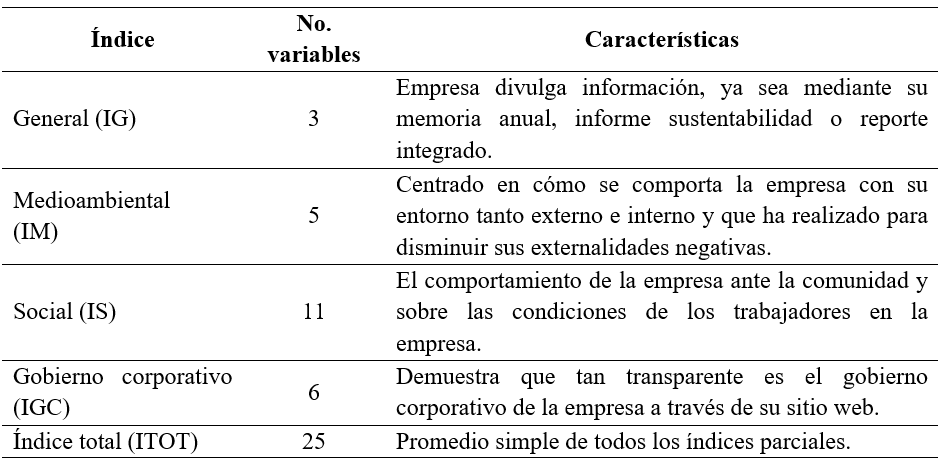 Se realizó la evaluación con base a una lista de chequeo compuesta por 25 variables las cuales analizan el contenido que presente en los sitios web de las entidades organizadas en 4 sub índices y un índice total (5 en total), los cuales se pueden ver en la Tabla 1.