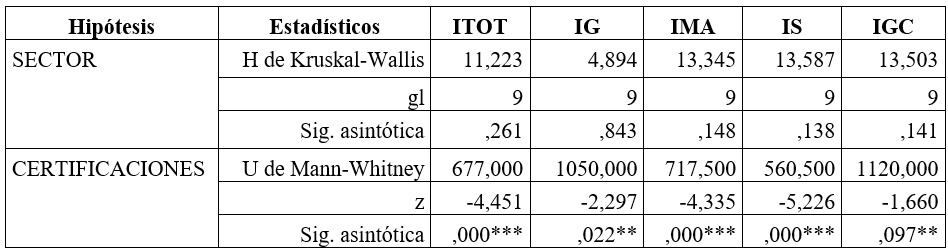 Para la comprobación estadística de las hipótesis aplicamos la prueba no paramétrica de Kruskal-Wallis en el caso de la variable sector (al ser varios grupos de empresas) y la U de Mann-Whitney en el caso de la variable certificaciones (dos agrupaciones de empresas) de tal forma de verificar si los estadísticos confirman la existencia o no de diferencias significativas, cuyos resultados podemos observar en la siguiente Tabla 4: