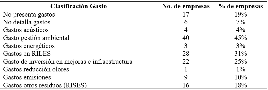 De la Tabla 5 cabe señalar que, respecto a los datos arrojados en la recolección, se demuestra el interés de las empresas en realizar gestiones ambientales y en la peor calificación quien presenta gastos en reducción de olores, sólo una empresa. Además, son 6 las empresas que informan sobre gastos incurridos nombrando las operaciones realizadas, pero no indica el monto desembolsado, sin embargo, en el total de las empresas 17 presentan una nota explicativa señalando que no se incurrieron en gastos ya sea por su actividad o el gasto no haya sido relevante para llevarlo a resultado.