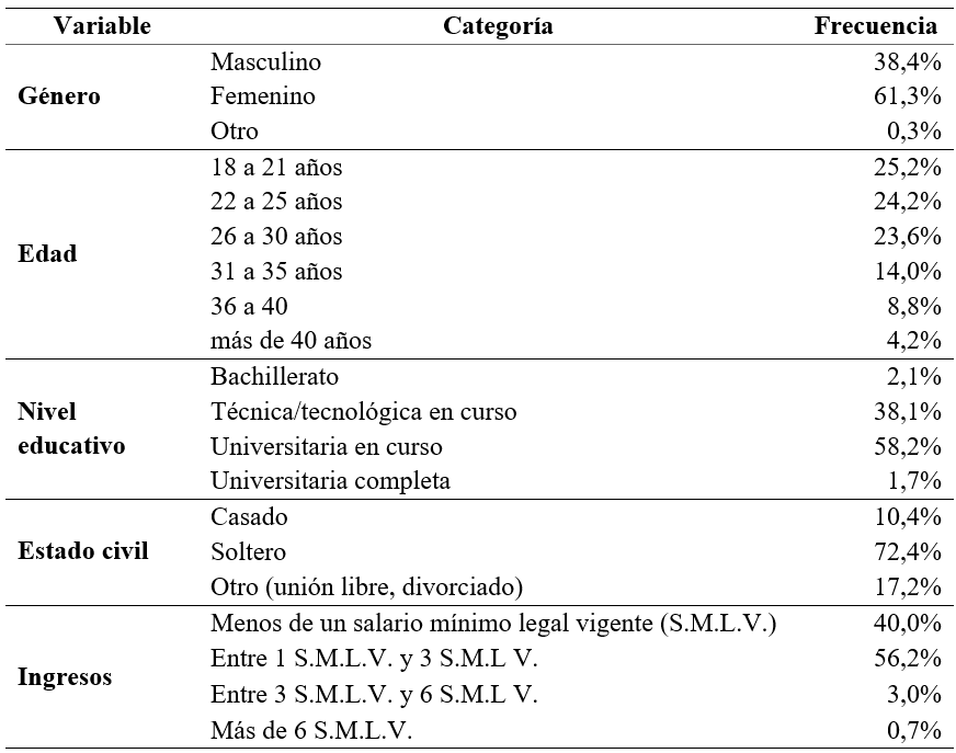 De la encuesta aplicada el 61,3% de los participantes eran mujeres, el 38,4% eran hombres y el 0,3% se identificó como otros, dentro de los cuales se encuentra el género no binario. De estos, la mayoría se encuentran en la edad de 18 a 30 años (72,2%), por lo que se cataloga como una muestra joven, de acuerdo con el público objetivo. De igual forma, el 72,4% eran solteros al momento del estudio (Tabla 1).