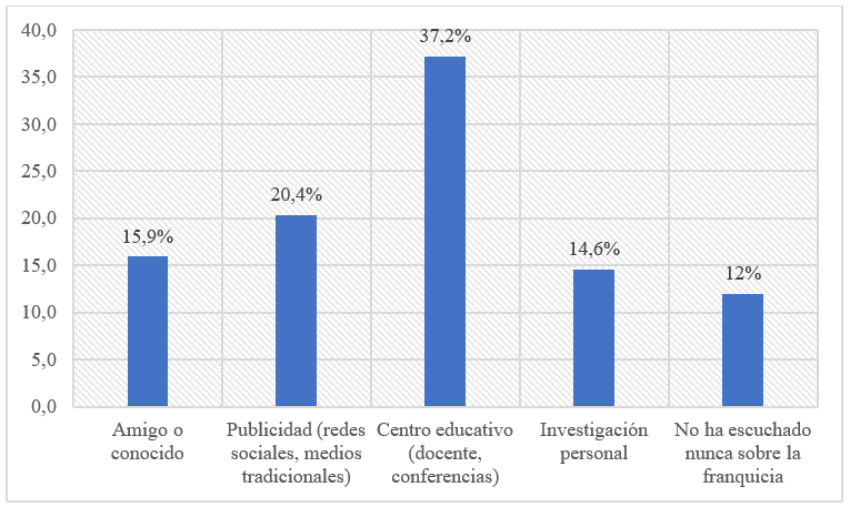 Cabe resaltar, como se evidencia en la Figura 3, que el centro educativo es la principal fuente de información y conocimiento acerca de las franquicias, a través de conferencias u otro tipo de actividades académicas y de acercamiento con esta categoría de emprendimiento (37,2%). De esta forma, los centros educativos, en concordancia con los resultados hallados por Vargas, Liévano y Calderón (2021), tienen un rol crucial en la masificación del conocimiento sobre los modelos de negocio para emprender, entre los que se encuentra la franquicia, debido a que inciden de forma positiva en la formación e intención de los estudiantes para crear empresa.