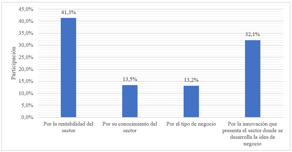 Respecto a la motivación para invertir, desde un enfoque de selección del sector económico donde se encuentra la franquicia, el 41,3% de la población encuestada seleccionaría el sector que les ofrezca la mejor rentabilidad. Lo que está en concordancia con el trabajo de Marulanda y Morales (2016), en donde se expone que las variables ingresos y dinero se presentan como una de las mayores fuerzas motivadoras para emprender en los jóvenes.