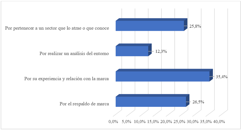 Por último, el tener una conexión familiar o de terceros también se puede identificar como una forma útil para dar a conocer las franquicias. En contraste, solo el 14,55% de los participantes manifestaron que conocieron el modelo de la franquicia por medio de una investigación personal orientada hacia la opción de invertir o de emprender. En este sentido, como expone el trabajo de Barzola, Bolívar y Navarrete (2020) se hace pertinente estimular el interés investigativo de los estudiantes que tienen intención emprendedora, con el fin de desarrollar habilidades transversales para aplicar en la vida y la sociedad.