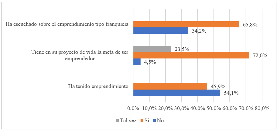 El 45,9% de los participantes manifestaron haber generado algún emprendimiento en el transcurso de su vida, estuviera o no activo. Lo que está en concordancia con el enfoque empresarial que se promueve desde la CUN (2015) como política institucional y, con la voluntad del 72% de los estudiantes, que desean ser emprendedores en algún momento de su proyecto de vida, mientras que el 4,5% definitivamente no desean generar empresa. Ante este contexto, el 34,2% de los estudiantes declaran que su conocimiento es nulo o inexistente sobre el emprendimiento tipo franquicia, mientras que el 65,8% de los individuos indican que conocen el término y por lo menos lo han escuchado (Figura 1).