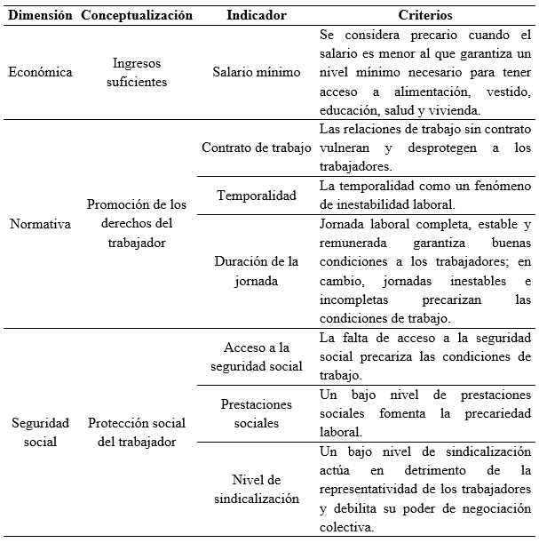 La precariedad describe de manera general el deterioro progresivo de las condiciones ocupacionales de la clase trabajadora; así pues, su significado ha sido objeto de análisis por diferentes autores dan origen a conceptualizaciones, tales como: fragmentación (Offe, 1992), individualización (Castel & Goldstein, 1994), desafiliación (Castel, 1995) y flexiprecarización (Sotelo, 1997). Para Castel (1998), la globalización imperante en el modelo económico actual aboga por la desregulación de las relaciones laborales para la disminución del costo de la fuerza de trabajo y, por ende, los costos de producción y el aumento de la productividad laboral como condiciones esenciales de la competitividad empresarial y territorial.